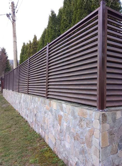 Ламелите за щори за ограда са изработени от поцинкована ламарина, покрити с два слоя грунд. Лицето и гърба на ламела е боядисано с ПВЦ релефна боя, имитация на Махагон.